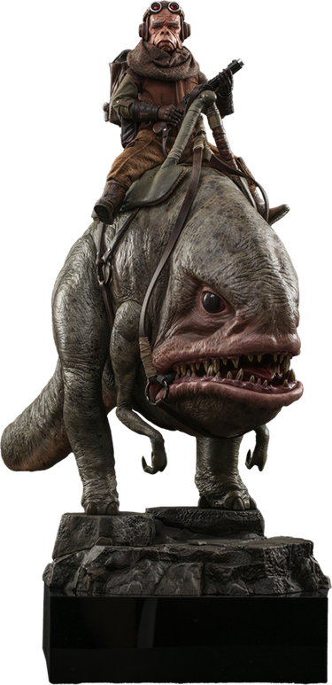 The Kuiil collectible figure features a newly developed head sculpt with stunning likeness, an outfit with highly detailed tailoring, a rifle with a tranquilizer dart, a pair of goggles, a backpack, a bucket, and a themed display base!
