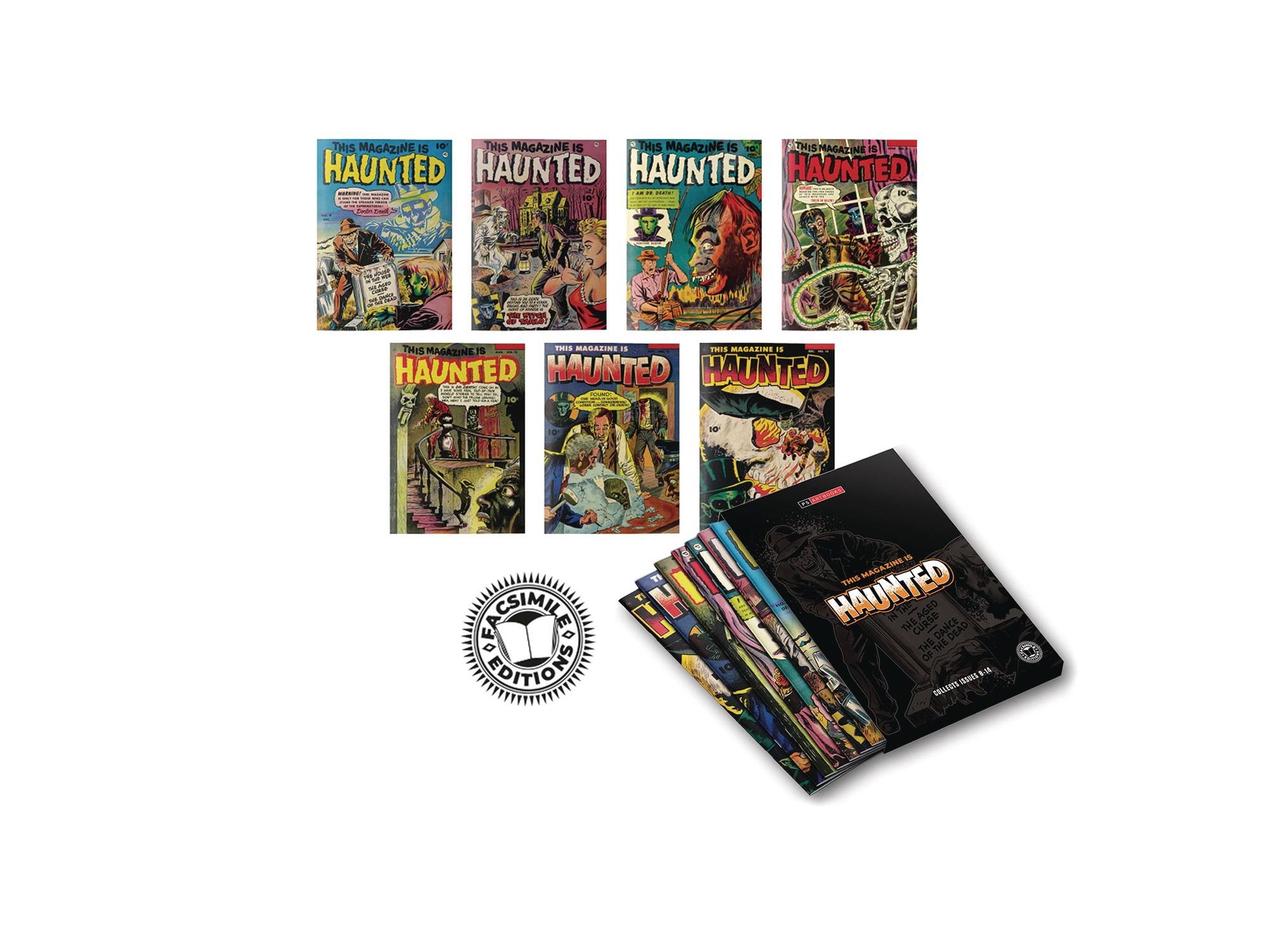 Collect the second wave of 7 issues from the legendary series by Fawcett comics, This Magazine is Haunted! For the first time ever collect 7 Facsimile Editions in one premium Slipcase! Issues 8-14, first printed by Fawcett Comics in December 1952 is full of ghoulish tales and undead horrors that will keep you awake at night! With artists such as Sheldon Moldoff, George Evans, Bernard Baily, Bob Powell and Leonard Frank we guarantee you will be left quaking in your boots! With over 200 pages of nightmare fuel you can't get much better bang for your buck!