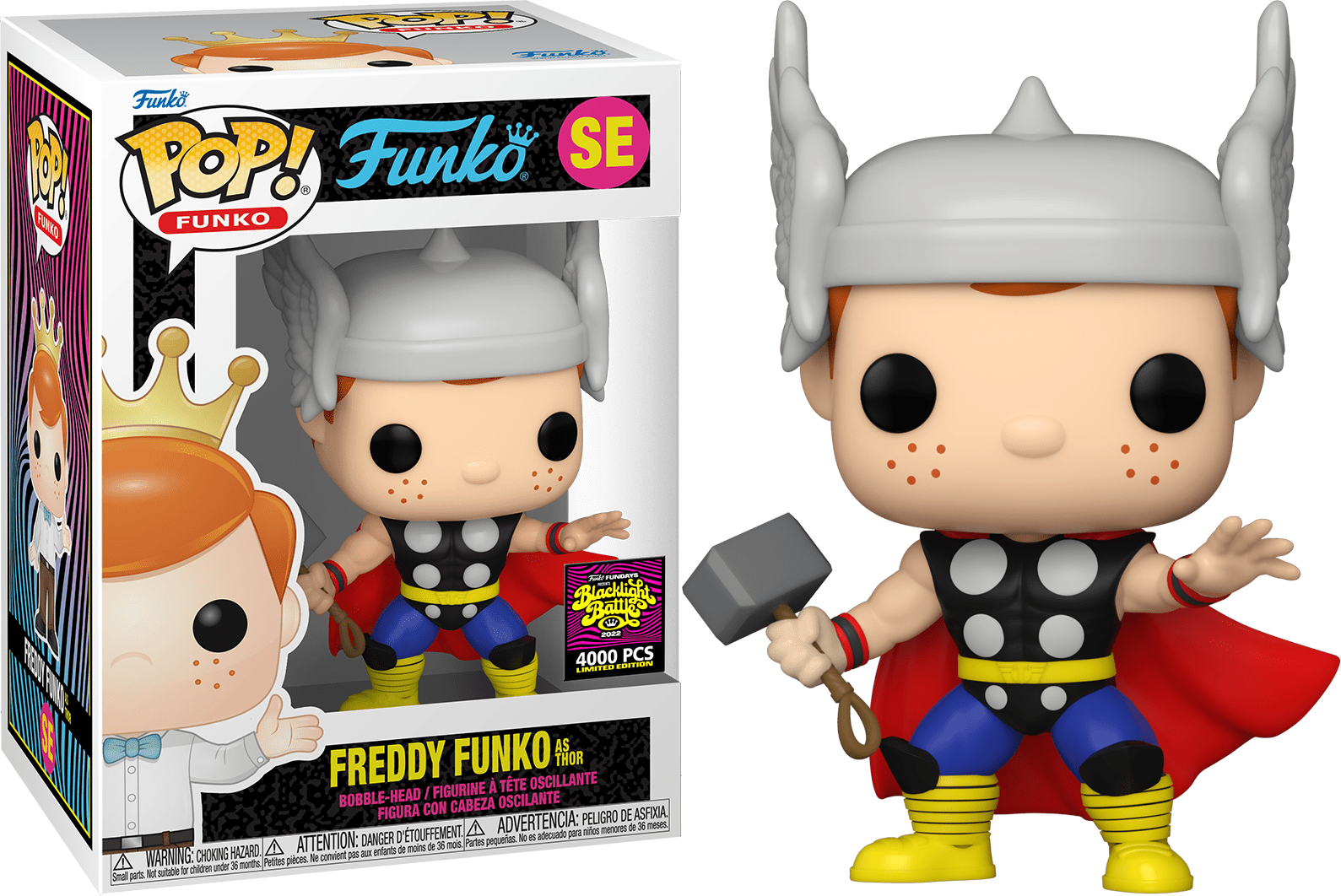 This Freddy Funk as Thor Pop! Vinyl Figure measures approximately 3 3/4-inches tall. Comes packaged in a window display box.