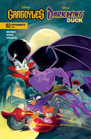 DEMONA WILL MAKE SURE THIS CAGED DUCK SINGS! The creators of the original Gargoyles and Darkwing Duck animated series return for the second installment of their hotly anticipated comics crossover adventure! With Darkwing’s magical amour Morgana Macawber now in Demona’s clutches, it’s a race against time for the Terror That Flaps in the Night to locate the two sorceresses before Morgana is coerced into revealing the location of the sinister spell book known as the Quackronomicon — and thus handing Demona the keys to world domination! But DW won’t get far without Elisa and Goliath’s help — and the head of the Manhattan Clan is down for the count until sunset. With half a day of downtime to contend with, can this unlikely trio of heroes crack the case before Morgana cracks under Demona’s interrogation? And while we’re on the subject, what have Launchpad and Gosalyn been doing all this time? The answers to these and many more burning questions will be revealed in the portent-filled pages of Gargoyles/Darkwing Duck #2 — crafted by tandem authors GREG WEISMAN and TAD STONES and artist CIRO CANGIALOSI, and enriched by hand-carved covers from STONES, CANGIALOSI, CLAYTON HENRY, and IVAN BIGARELLA!