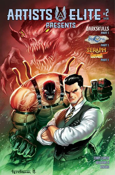 Artists Elite Presents #2 features the premiere of 3 new stories! Ben Templesmith's (30 Days of Night) Darkskulls where five weary and jaded immortals tied to the life-force of the planet might bother to come together to save it one last time. Freddie Williams II's (Batman/TMNT) Belong tells how a lonely, quiet, creative kid finds the family he's always wanted by eagerly paying everything for it. Ryan Kincaid's (Cover Artist) Seraph and the Seven questions if sending one of the original angels will be enough to save humanity from the Seven Deadly Sins!