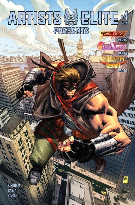 Artists Elite Presents #4 features the continuation of 3 stories! In Tyler Kirkham's (Superman) Final Boss, a mysterious onlooker recruits Tommy Brazen with a special offer that could help him on his quest to find out the truth about his past. Alé Garza's (Teen Titans) SandWenches pits the heroes against the hulking ManCat! Who will come out on top as the infiltration of Rodden Ridge pushes on? Ryan Kincaid's (Persuasion) Seraph and the Seven continues as Seraph, with the aid of Thomas, hunts the Sins who have come together to destroy the human race!