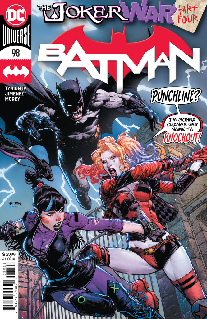 “The Joker War” part four of six! Batman is at his most vulnerable following a massive dose of an experimental new Joker toxin. With the Dark Knight haunted by demons and visions, it’s up to Harley Quinn to protect him while he recovers—because Punchline is on her way!