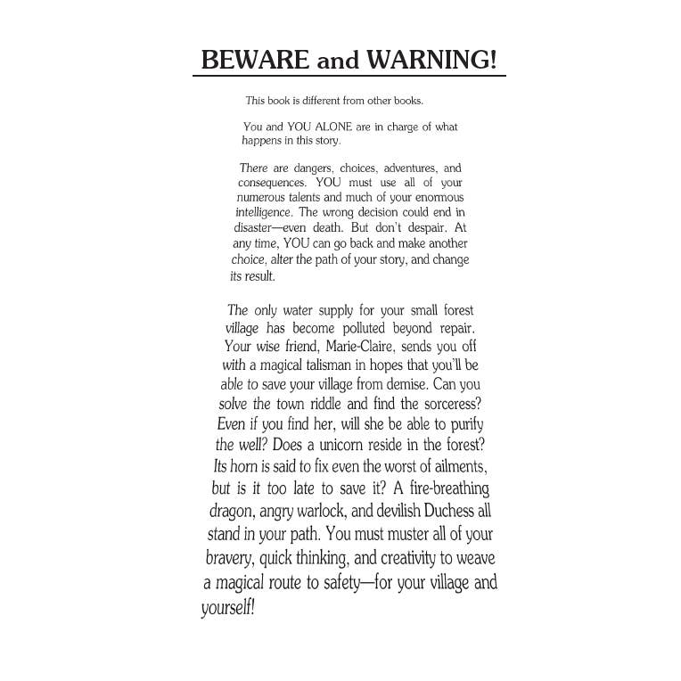 Ages 9-12 | Grade Levels 4-8 | Choose from 27 Possible Endings Written in the second-person, the reader is the hero of the story who makes decisions along the way. Only a unicorn's horn can purify the water in your medieval village, so you set off to find one. Can you solve the town riddle and find the sorceress? Does a unicorn reside in the forest? A fire-breathing dragon, angry warlock, and powerful wood-witch all stand in your path. Choose Your Own Adventure is the 4th bestselling children's book series of all time. Empowering generations of children through choice, it is widely commended for its appeal to reluctant readers.