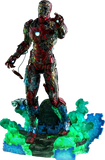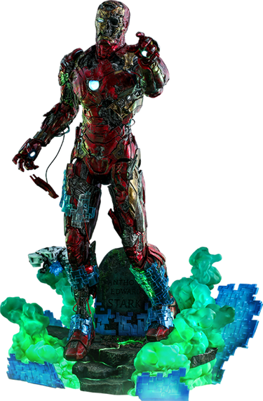 The incredibility detailed figure is crafted based on Mysterio’s Iron Man Illusion in the movie, features heavily weathering effect with scratches and rust; overall expertly painted metallic red, gold and silver colored corroded armor; a newly developed severely damaged helmeted head with LED light-up function, revealing partial skull on the left; exposed wires attached to the shattered Iron Man armor revealing fine mechanical details; LED light-up functions on Arc Reactor on chest, and hands. Last but not least, a highly elaborated diorama figure base inspired by the hallucination fight with LED light-up function design; comes with a droid and green smoke effects; and pixelated effect accessories to complete the remarkable visual setting.