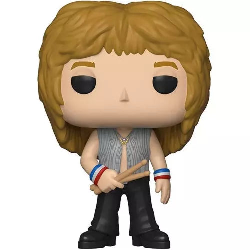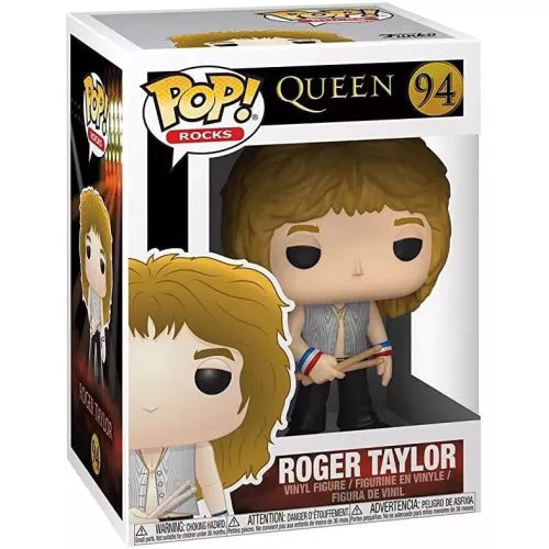 This POP! Rocks collectible measures in the classic Funko size and comes in a vibrant, artistically-designed box that highlights Roger Taylor's role in Queen. The figure depicts Taylor with his signature hairstyle, holding drumsticks, and wearing an eye-catching outfit, complete with wristbands and a vest. The attention to detail is evident, making this figure a fantastic representation of his iconic stage presence.