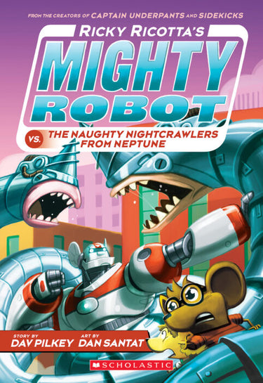 By flipping the pages, the reader may view animated illustrations that follow Ricky Ricotta, a small mouse, his giant flying robot, and his annoying cousin Lucy, as they battle the nightcrawlers from Neptune that are invading through a wormhole.
