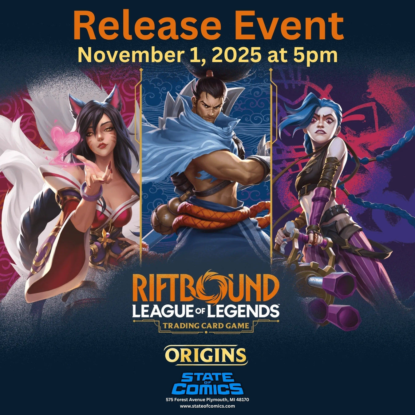 We’re kicking off the Riftbound Release Event at State of Comics on Saturday, 11/1 starting at 5:00 PM (arrive early!). Prepare for modified champion-deck play, thrilling new cards, and a fun, community-driven evening. Spots are limited—secure your seat today and join us for this exciting launch!