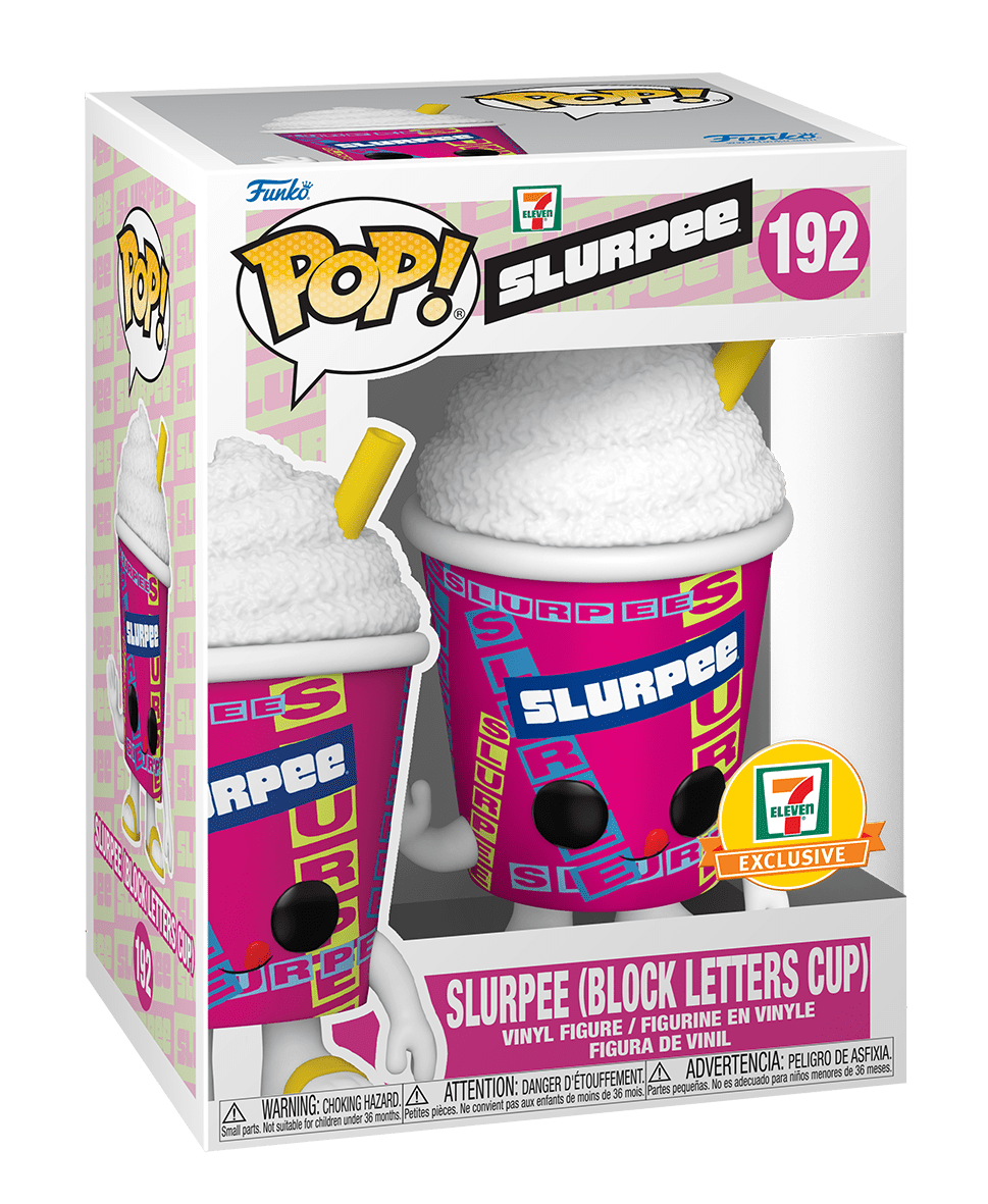 This Slurpee (Block Letters Cup) Pop! Vinyl Figure measures approximately 3 3/4-inches tall. Comes packaged in a window display box.