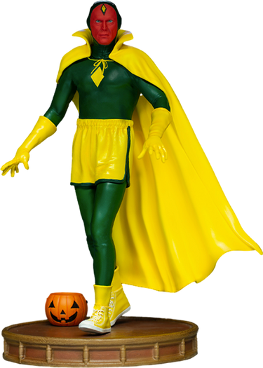 During Halloween in the small town of Westview, New Jersey, the synthozoid Vision, formerly an ally of the Avengers, says goodbye to his wife Wanda Maximoff, with whom he shares an idyllic suburban life. Vision is a volunteer on the community surveillance patrol and leaves for duty properly dressed as the holiday requires. He is wearing a costume similar to the original version of the character from the comics, but with the characteristics of cosplay, in a more laid-back way, with sports shorts, sneakers, and yellow socks. His costume has such an iconic look that he compares it to a luchador. In this way, at the request of fans and collectors, Sideshow and Iron Studios present the "Vision Halloween 1:10 Art Scale Statue" based on the sixth episode of the Disney+ show WandaVision, "All-New Halloween Spooktacular!"